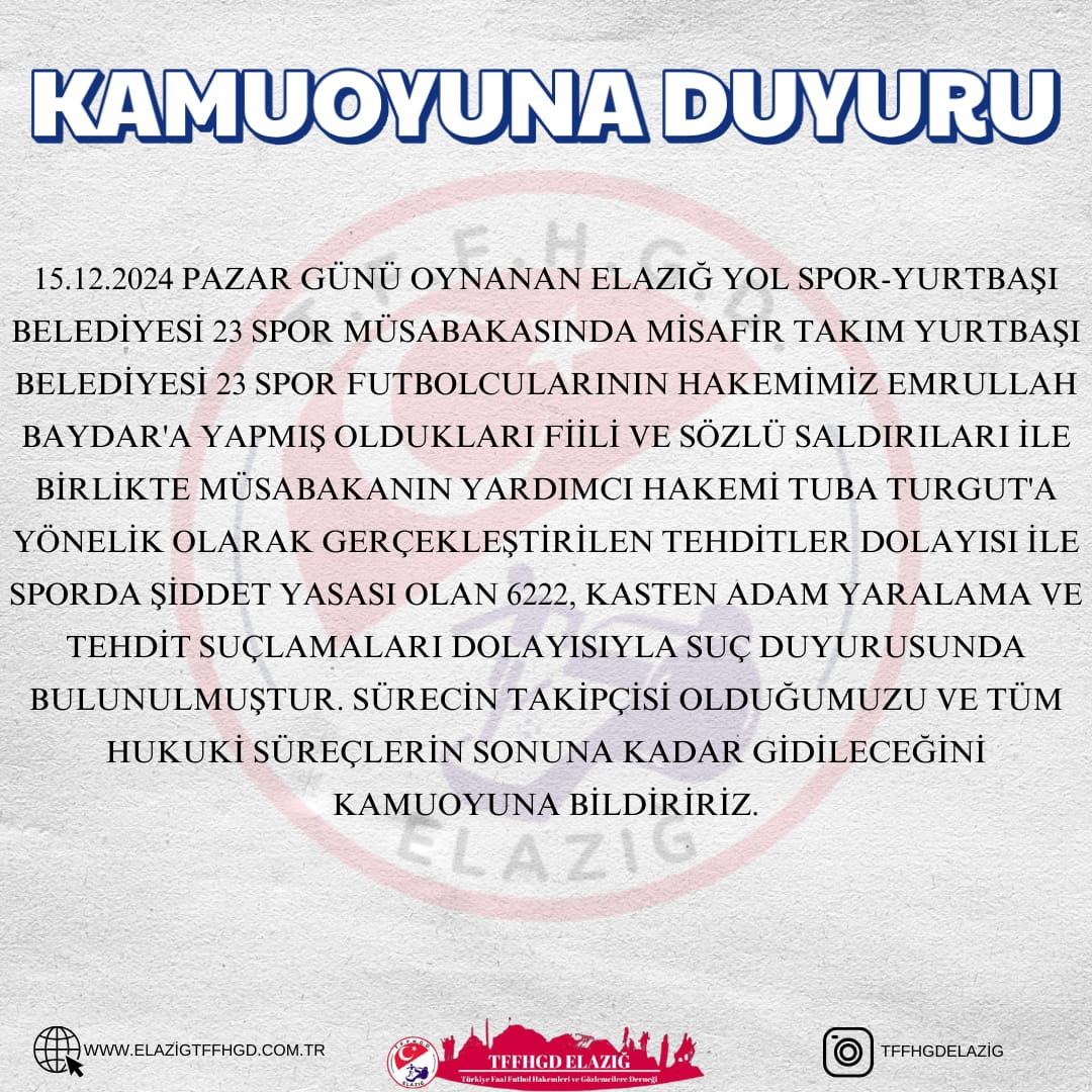 15.12.2024 PAZAR GÜNÜ OYNANAN ELAZIĞ YOL SPOR-YURTBAŞI BELEDİYESİ 23 SPOR MÜSABAKASINDA MİSAFİR TAKIM YURTBAŞI BELEDİYESİ 23 SPOR FUTBOLCULARININ HAKEMİMİZ EMRULLAH BAYDAR’A YAPMIŞ OLDUKLARI FİİLİ VE SÖZLÜ SALDIRILARI İLE BİRLİKTE MÜSABAKANIN YARDIMCI HAKEMİ TUBA TURGUT’A YÖNELİK OLARAK GERÇEKLEŞTİRİLEN TEHDİTLER DOLAYISI İLE SPORDA ŞİDDET YASASI OLAN 6222, KASTEN ADAM YARALAMA VE TEHDİT SUÇLAMALARI DOLAYISIYLA SUÇ DUYURUSUNDA BULUNULMUŞTUR. SÜRECİN TAKİPÇİSİ OLDUĞUMUZU VE TÜM HUKUKİ SÜREÇLERİN SONUNA KADAR GİDİLECEĞİNİ KAMUOYUNA BİLDİRİRİZ
